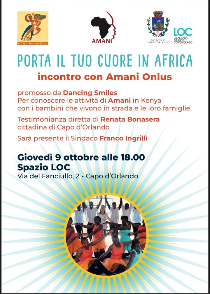 PORTA IL TUO CUORE IN AFRICA: INCONTRO CON AMANI ONLUS A CAPO D'ORLANDO Giovedì 9 ottobre alle ore 18, presso lo Spazio LOC di Via del Fanciullo 2 a Capo d'Orlando,si terrà l'incontro "PORTA IL TUO CUORE IN AFRICA", un momento si sensibilizzazione e solidarietà promosso dall'associazione Dancing Smi